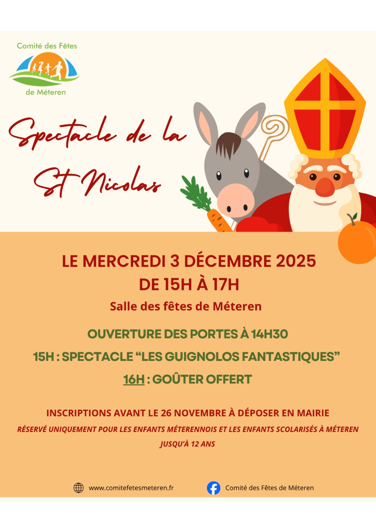 Le spectacle de la St Nicolas 2025 se déroulera le mercredi 3 décembre 2025 à la Salle des Fêtes de Méteren.